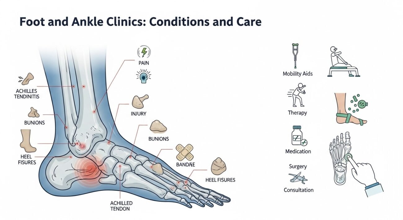 The foot and ankle form the foundation of all upright activity — supporting the full body weight through every step, run, and jump. Foot and ankle conditions are remarkably common: plantar fasciitis is one of the leading causes of heel pain, affecting 10% of the population; ankle sprains are the most common sports injury; and diabetic foot disease is the leading cause of non-traumatic limb amputation. Podiatry and orthopedic foot/ankle clinics provide specialized care for the full spectrum of foot and ankle conditions. This guide explains common conditions and their clinical management.